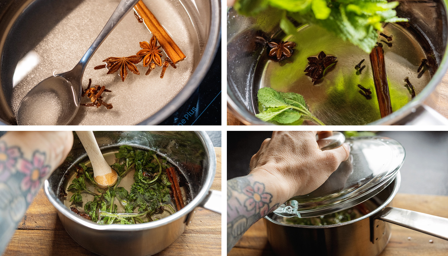 - Odstavte kastról zo sporáka a pridajte celé stonky mäty. Ja ich v tekutine ešte jemne pučím tĺčikom na mojito (môžete si pomôcť napríklad aj drevenou vareškou) – vďaka tomu sa uvoľní viac chuti.