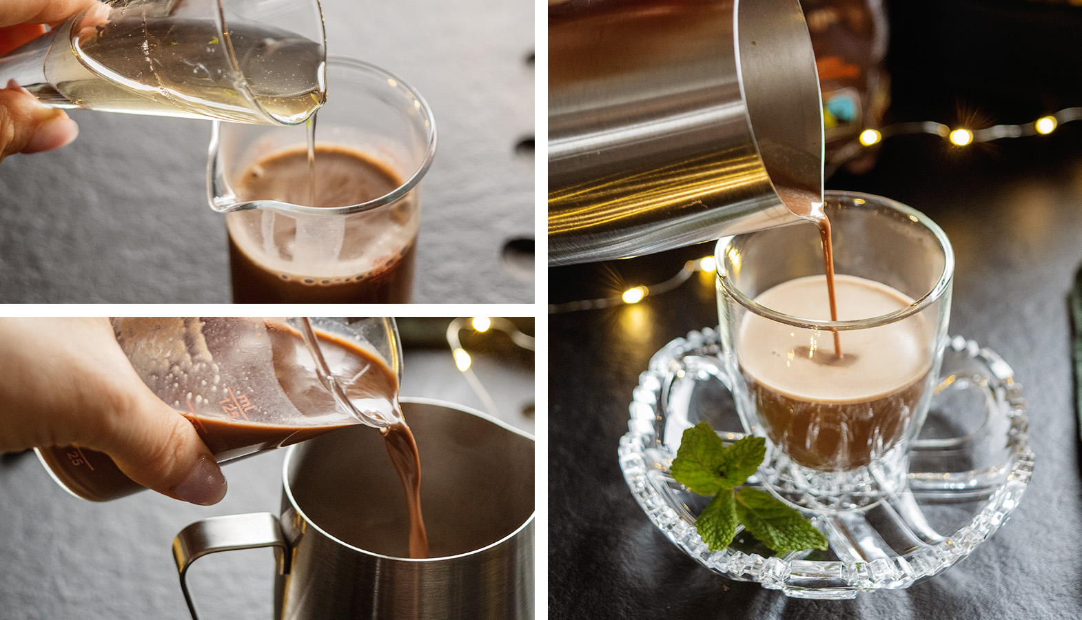 - Do čokoládového mlieka vmiešajte mätový sirup a čerstvo pripravené espresso.