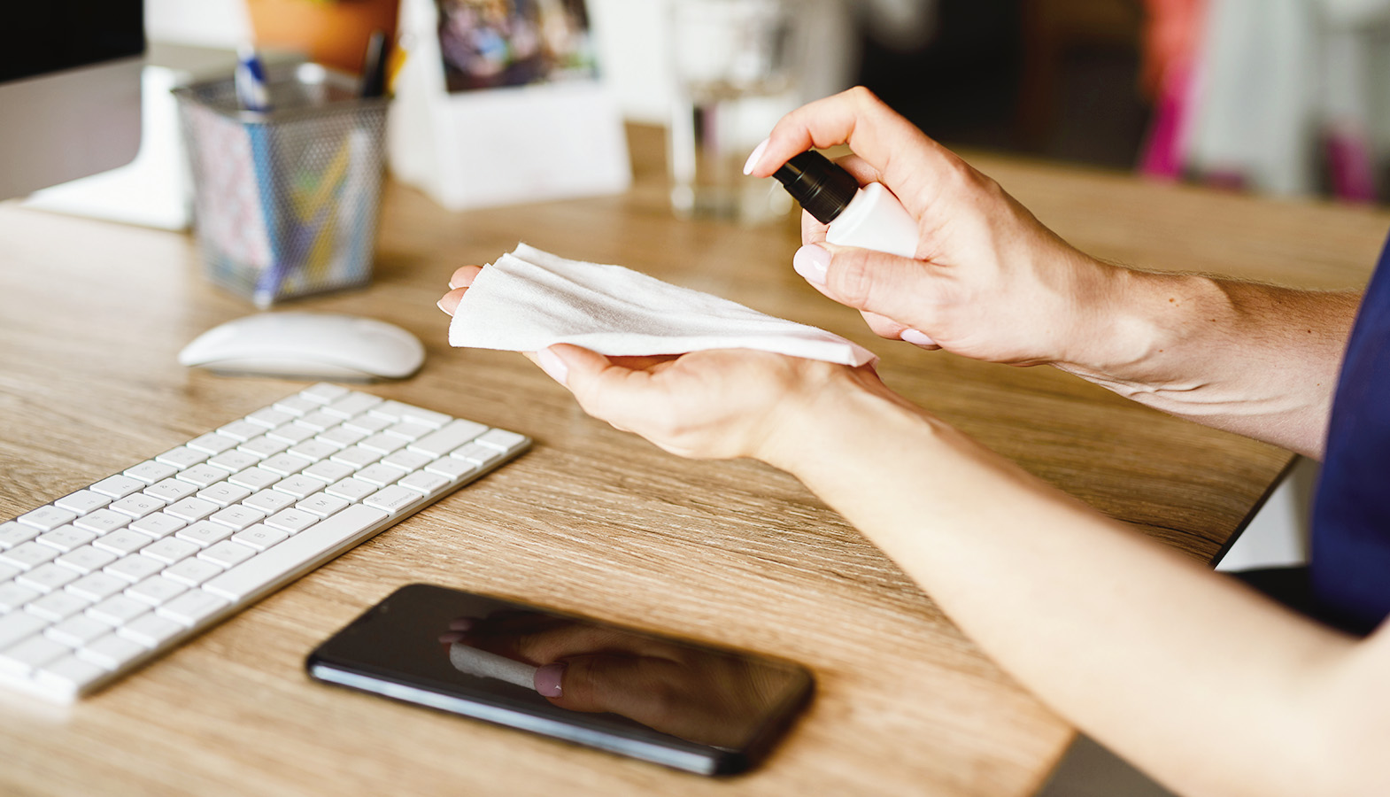 2. Dezinfekčný roztok streknem na handričku z mikrovlákna a šetrne telefón utriem zo všetkých strán.