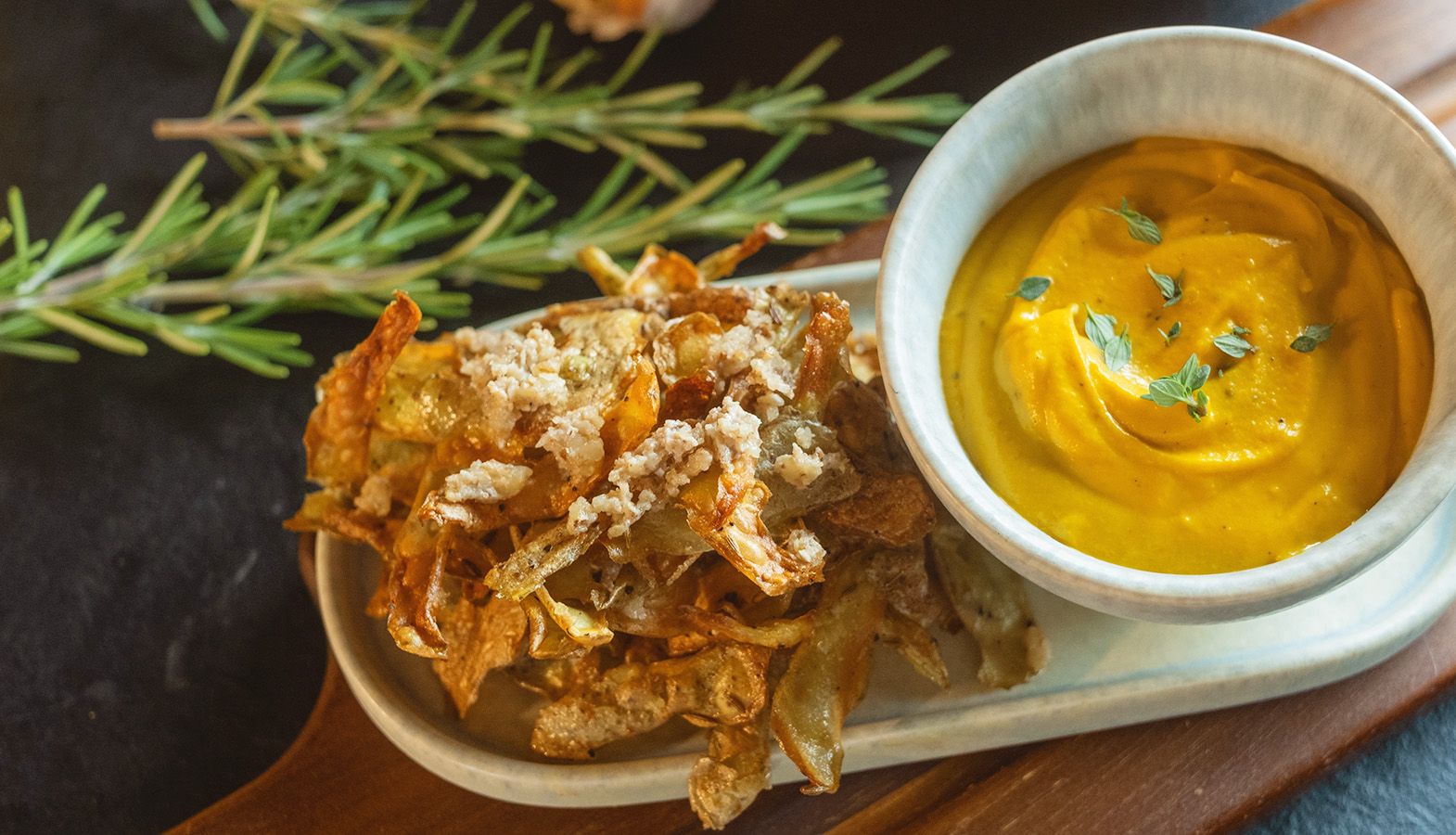Predjedlo: Pečené zemiakové šupky s tekvicovým dipom