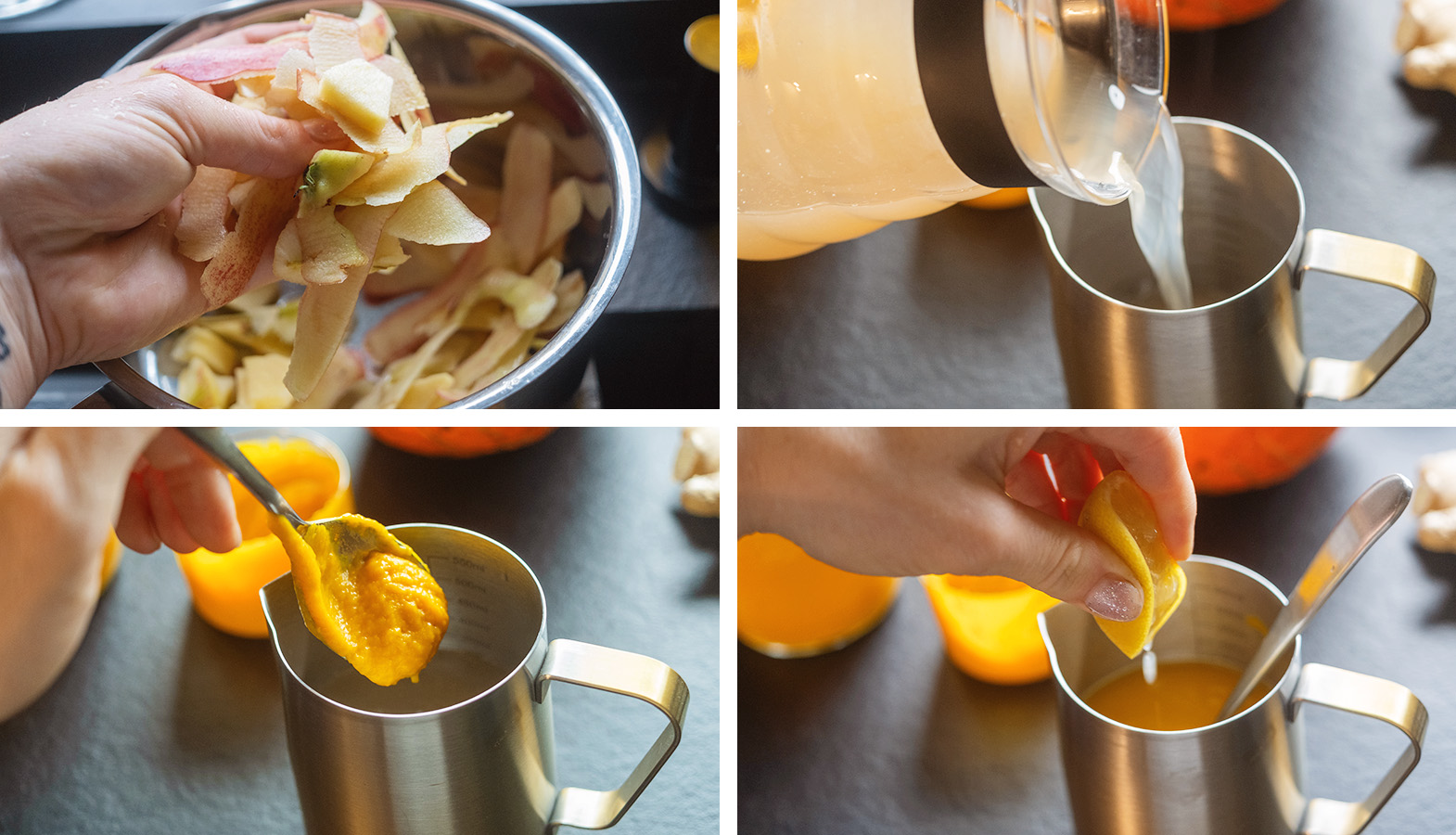 - Do kastrólika vložte šupky z jabĺk, nastrúhaný zázvor a škoricu. Zalejte asi 500 ml vody, priveďte do varu a varte na miernom stupni asi 15 minút.
